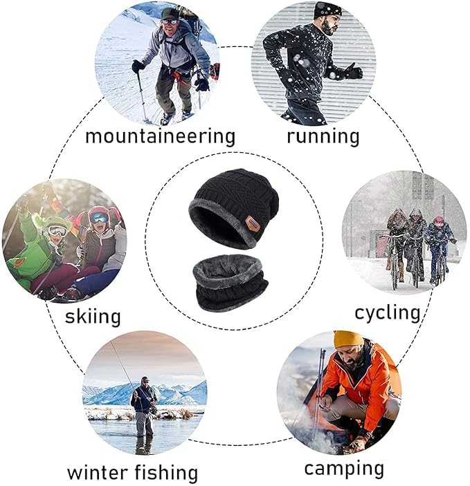 - This winter knit cap and scarf combo is ideal for daily wear for indoors and outside activities such as sleeping, walking your dog, cycling, skiing, snowboarding, running, camping, travelling, fishing, hiking, motorcycling, and more.
