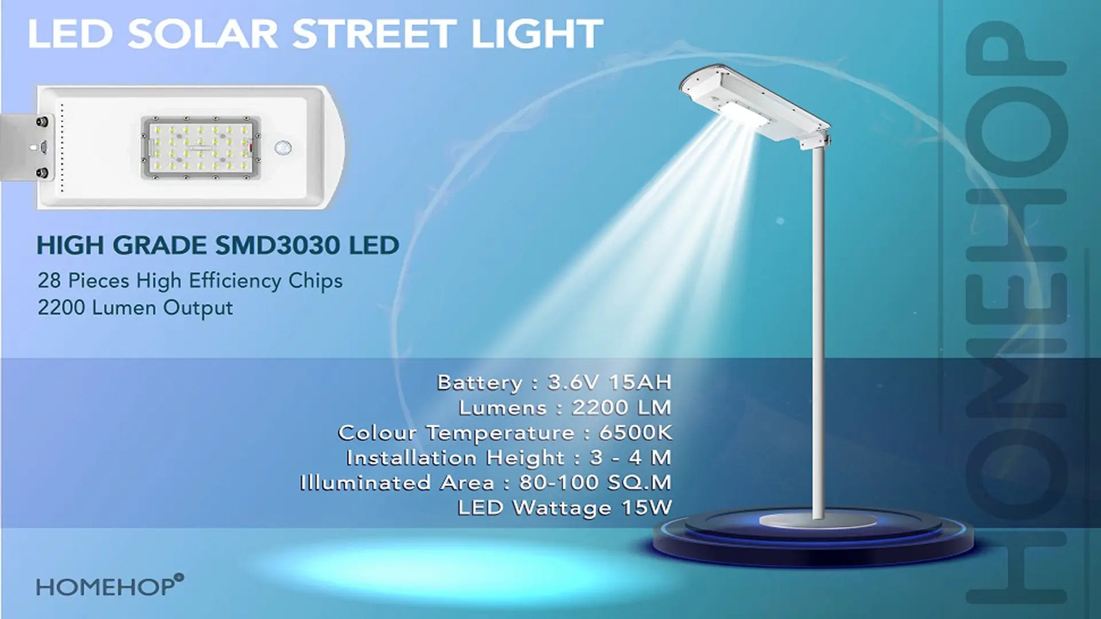 - [80W [LED WATTAGE: 15W]/2200 HIGH LUMENS |28 SMD3030 LED] Homehop 80 Watt all in one integrated outdoor solar street light comes with 28 SMD 3030 chipset LEDs, which provides 1-4 days of continuous and highly bright lighting(depends on mode).
