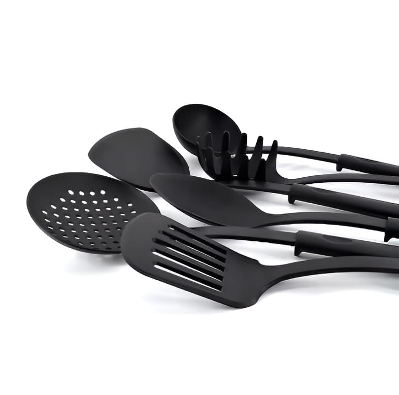 - 6 different silicone serving utensils: Ladle, Pasta Fork, Spoonula, Slotted Spoon, Tongs, Turner, Large Spatula.