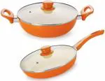Nirlon Orange Non-Stick Induction Base Ceramic Fry Pan 1.5 L & Deep Kadhai 3.6 L with Glass Lid