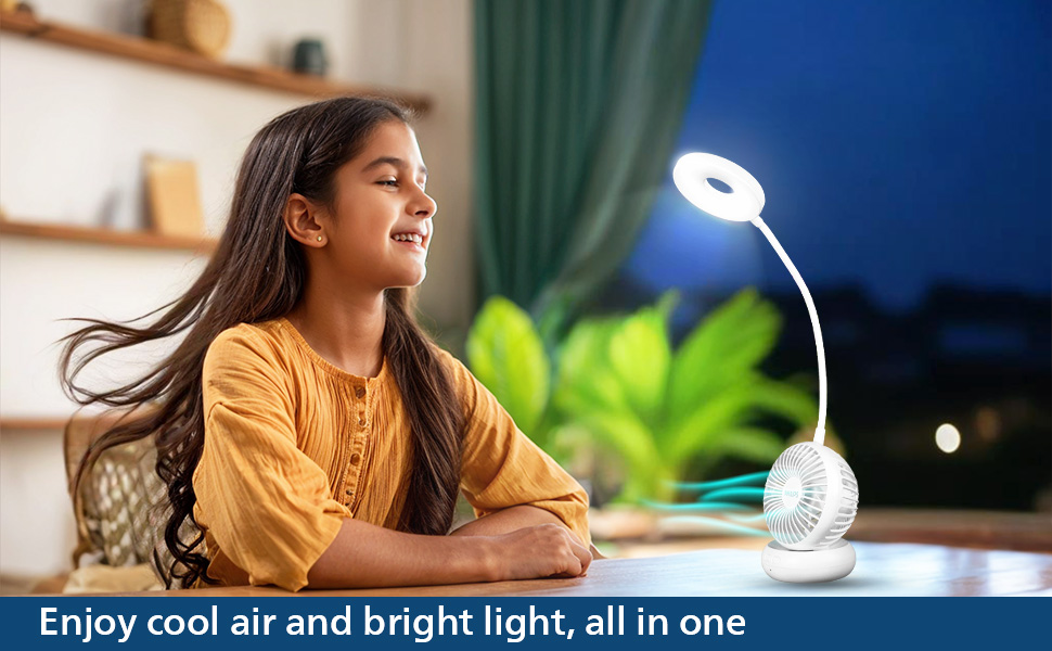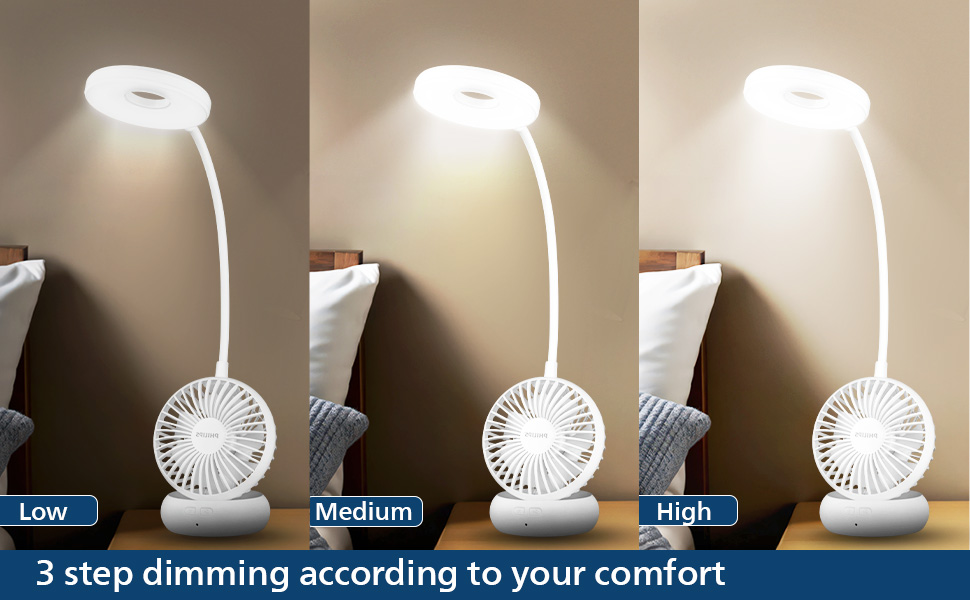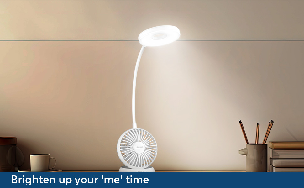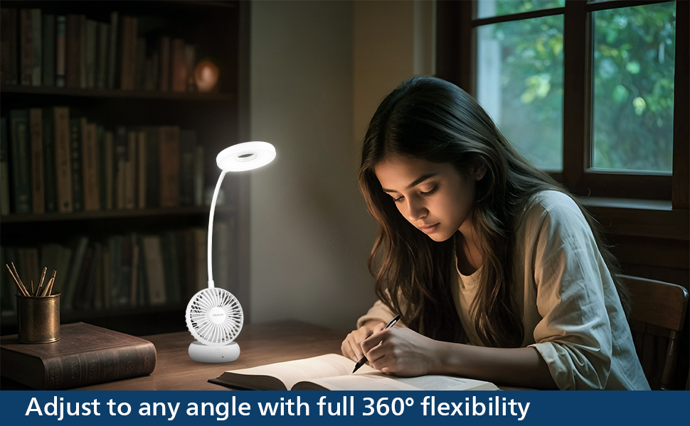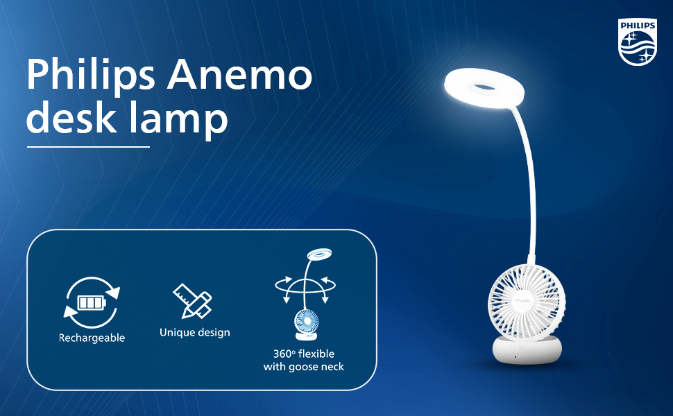 PHILIPS Anemo Rechargeable LED Table Lamp with Fan | 5W Bedside Dimmable LED Desklight with Gooseneck & 360 degree Flexibillity | 2200 mAh Battery with 2.5 hrs Backup