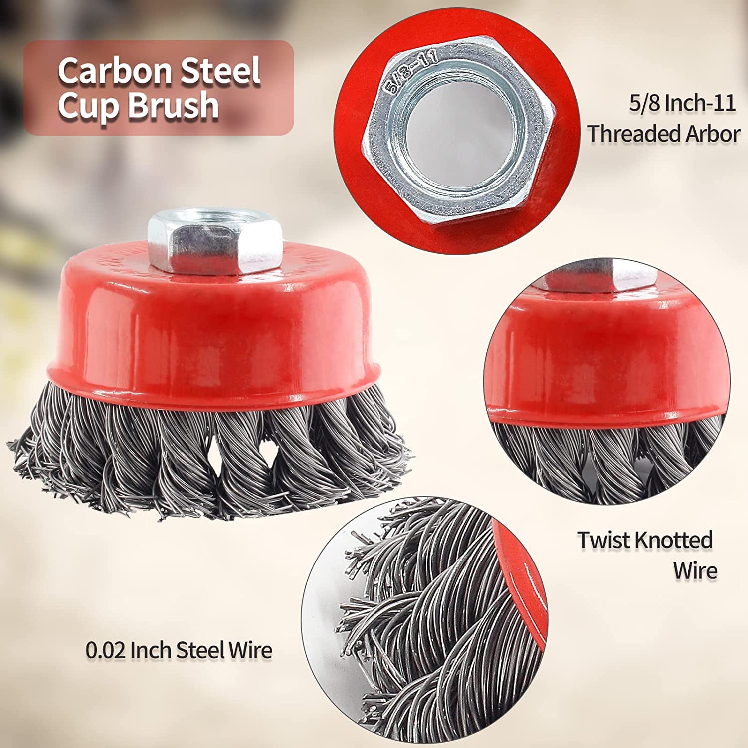 - Angle grinder grinding brush uses 0.020in high-strength hardened carbon steel wire has 4 times better performance than the others in the market, and has perfect knotting integrity.