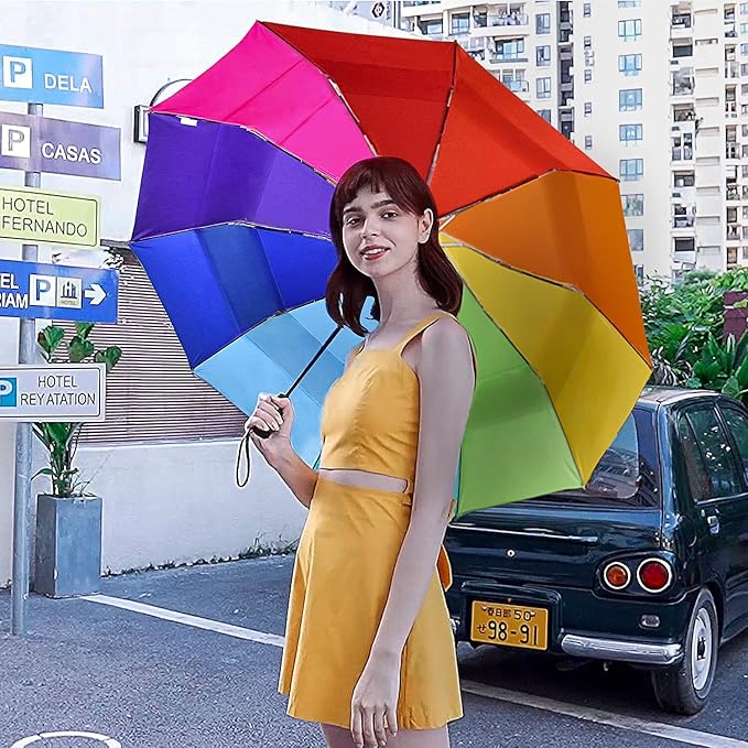 - Vibrant Rainbow Canopy: Eye-catching multi-colored design adds a pop of color to rainy days.