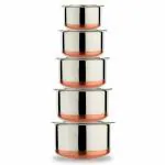 stainless steel copper bottom 5 pcs tope/patila, with lid 10 pcs set Tope Set with Lid 3 L, 2.5 L, 1.5 L, 0.9 L, 0.75 L capacity 21 cm, 19.5 cm, 18.2 cm, 16.7 cm, 15 cm diameter