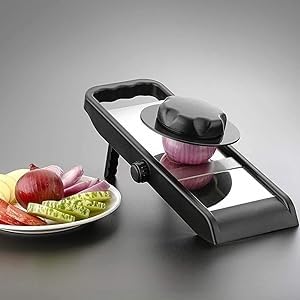 - The blade is made of high quality stainless steel with sharp edge and hard texture. The heavy and sturdy stainless steel frame is more durable than ordinary plastic slicer.