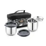 - Capacity of containers: 1 Containers: 350ml Each + 1 Container: 250ml; Contents include: Lunch Bag; Colour: Bag Colour: Black | Container Colour: Silver