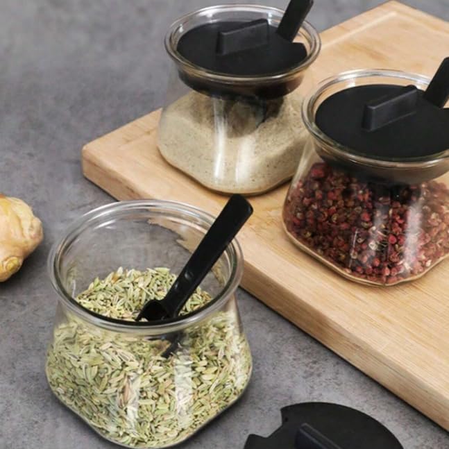 - Material: transparent thickened glass condiment container, made of high-quality glass and PP plastic cover, comes with 3 spoons and 1 base tray, sturdy and anti-corrosion, can keep condiments clean and moisture-proof sealed and kept fresh.