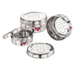 VARNA Stainless Steel Hole Puri Dabbas/Flat Canisters/ Dhaniya Dabba/Coriander/Chilly/Vegetable and Fruits/ Sprout Maker with Air Ventilation Set of 3
