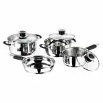 - Package Content: 1- Piece Stainless Steel Saucepan (16cm/1.5 Litre), 1- Piece Stainless Steel Casserole (18 cm /2.1 Litre),1-Piece Stainless Steel Casserole (20 cm/3.0 Litre),1- Piece Stainless Steel Frypan (20 cm) and 3- Pieces Glass Lids