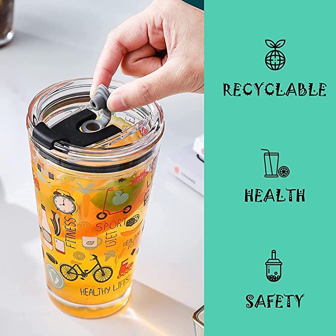 VM PARTNER Glass Cup with Straw and Lid Design Cartoon Pattern
