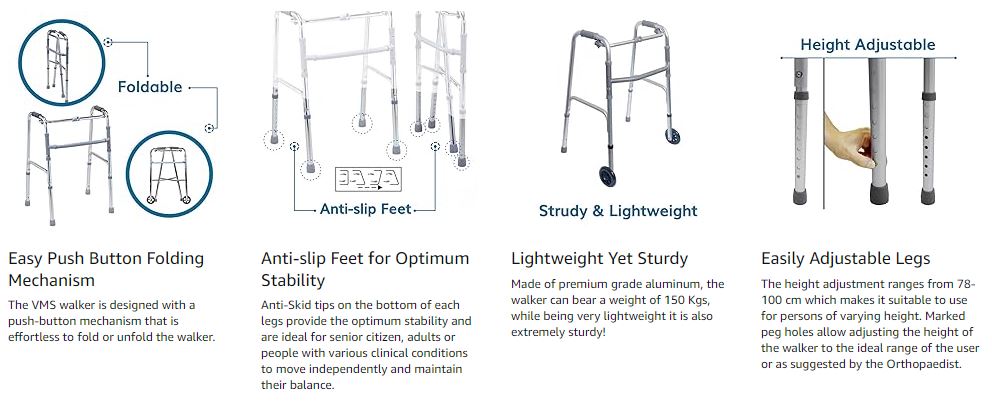 VMS Careline Walkers and Height adjustable Walker for Adults Easy walk (Walker without wheel)