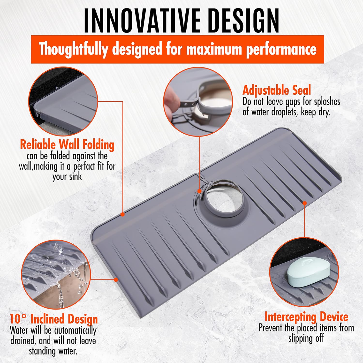 - Self-supporting mat: rinse splash guard has a double drainage design, the collected water droplets can be passed through the drain in the sink, keep the countertops dry and clean.