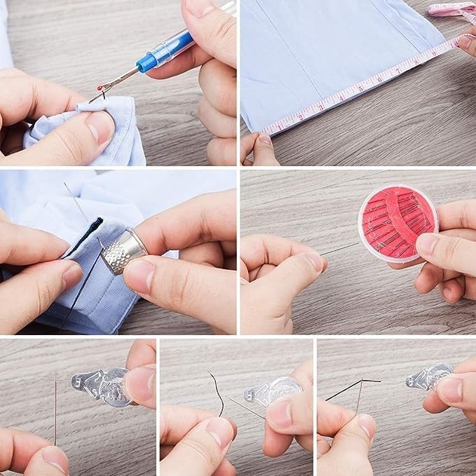 - With this sewing kit, you can hemming cloths, sewing on buttons, quick temporary hems and other emergency clothes repairs.