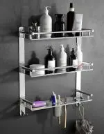 - Gosai Multi Use Shelf :- Gosai Made Luxurious Stainless Steel 2 Layer Multipurpose bathroom Shelf Organizer with Double Soap Dish Holder, Toothbrush Holder and Hooks for Bathroom Accessories Soap stand tumbler stand holder