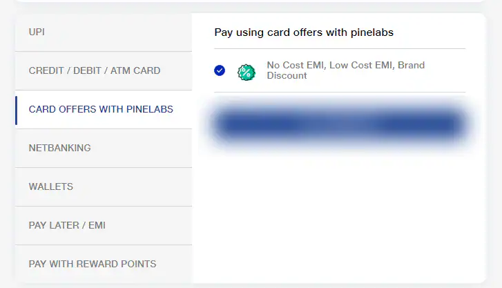 Step 2 – Under Make Payment section ,choose Card Offer with Pinelabs and select No cost EMI , Low Cost EMI , Brand Discount.