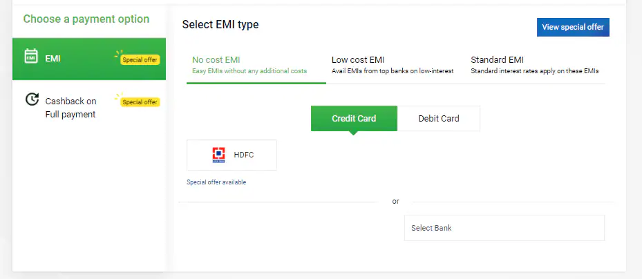 - Where the EMI interest is discounted upfront on the Payment page. These products have No Cost EMI offers listed as follows on the product Page under Finance Offers 3/6/9 Months No Cost EMI on HDFC and ICICI bank credit cards if this is the only product in cart